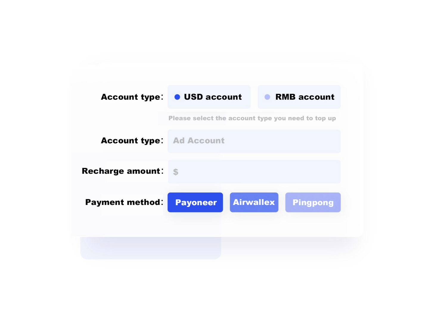 Supports multiple recharge channel:Payoneer、Airwallex、Pingpong、Paypal....